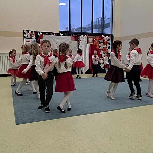 Najstarsza grupa przedszkolna – „Lwy”, której wychowawcą jest pani Natalia Kulpińska, przygotowała dla całego przedszkola oraz swoich rodziców piękny występ artystyczny. Dzieci z ogromnym zaangażowaniem recytowały wiersze, śpiewały piosenki patriotyczne i zaprezentowały niezwykle efektowny mix tańców narodowych, w którym połączyły Poloneza, Kujawiaka i Oberka.